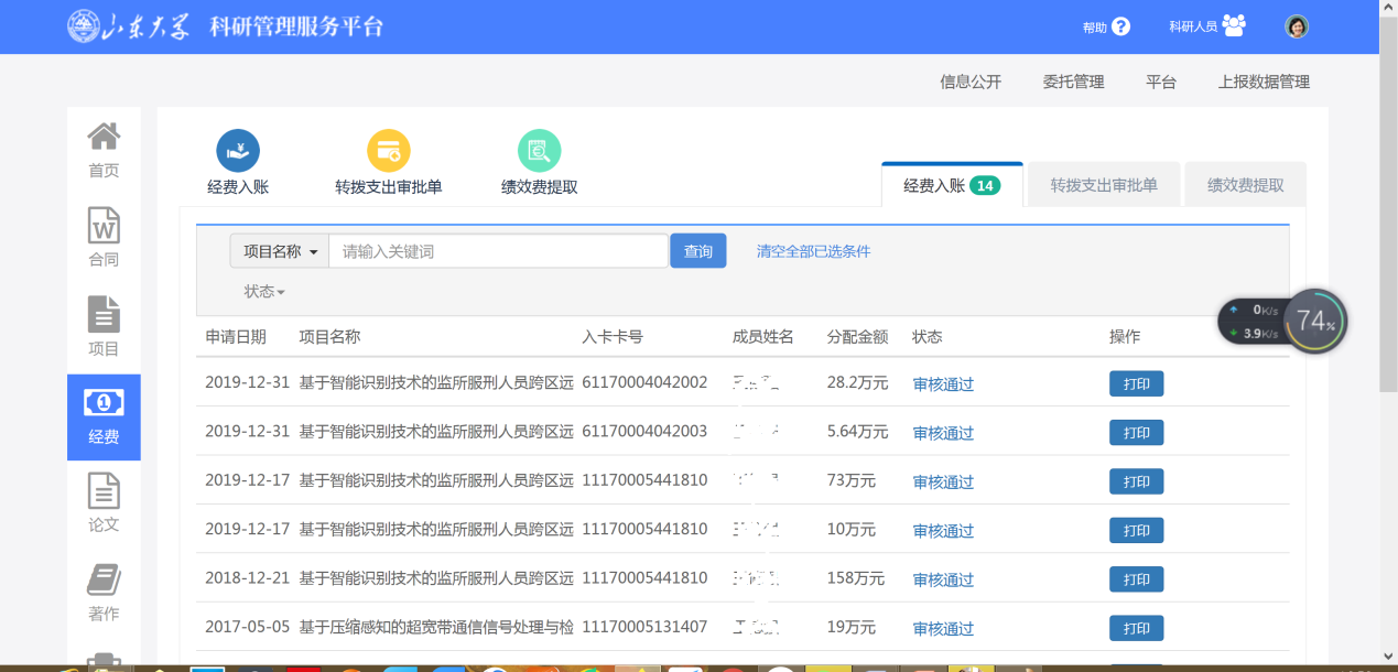 (4) 科研项目经费到账情况证明材料,请登入新版科研管理系统,如下图,点击“经费”栏目,将2020年度到账部分截图。