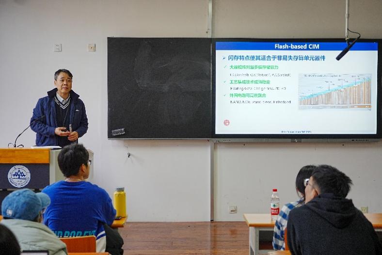 陈杰智就“闪存技术存算一体“的研究方向展开了详细讲解。他介绍到该方向下研究内容主要为非挥发性半导体存储器、以及新型存算融合与三维集成等,通过结合材料计算、架构设计,以及芯片测试等多种研究手段研究高可靠性新型纳米器件及半导体存储器,让大家对对闪存技术存算一体的研究有了更深刻的理解。武继璇向同学们介绍了微电子器件与纳米技术的研究领域,介绍了新型铪基铁电薄膜器件以及新型二维材料及器件研究,简单阐释了各种研究工作的原理,极大地激发了在场同学的学习和研究热情。