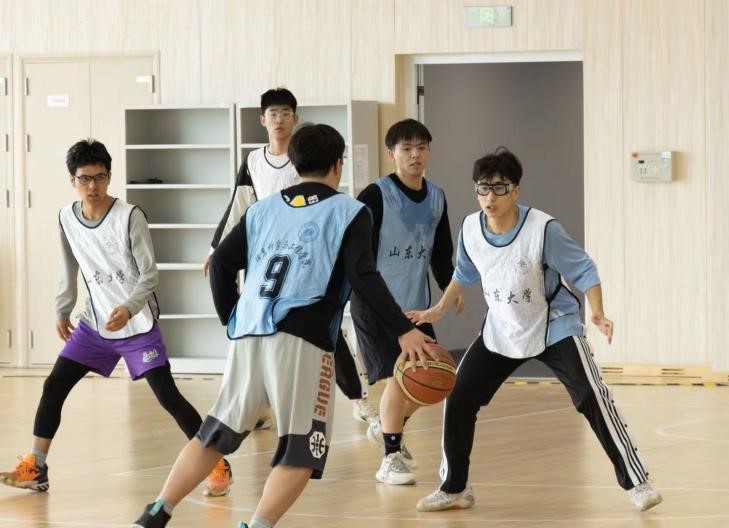 中国海洋大学来访的师生们在简单的参观完taptap点点体育青岛校区的运动场馆后,一场篮球友谊赛在青岛校区综合体育馆拉开序幕。伴随着一声哨响,双方队员立刻进入激烈的角逐状态。中国海洋大学球队队员配合默契,连连突破上篮得分,开场就打出了11 vs 6的小高潮。taptap点点体育信息科学与工程学院球队也毫不退缩,以默契的配合和犀利的突防赢得了场边观众的一阵阵欢呼声。