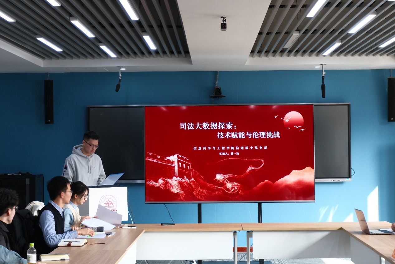 活动伊始,与会党员集体观看了专题视频《AI伦理与道德问题:人工智能的挑战与责任》,深刻认识了AI技术应用中潜在的伦理风险与治理需求。在汇报交流环节,信通硕士党支部书记蓝一翔以《司法大数据探索:技术赋能与伦理挑战》为题进行汇报,系统阐释了司法大数据的创新应用,剖析了人工智能引发的伦理挑战,并呼吁建立多方协同的治理机制,保障司法大数据的健康发展。