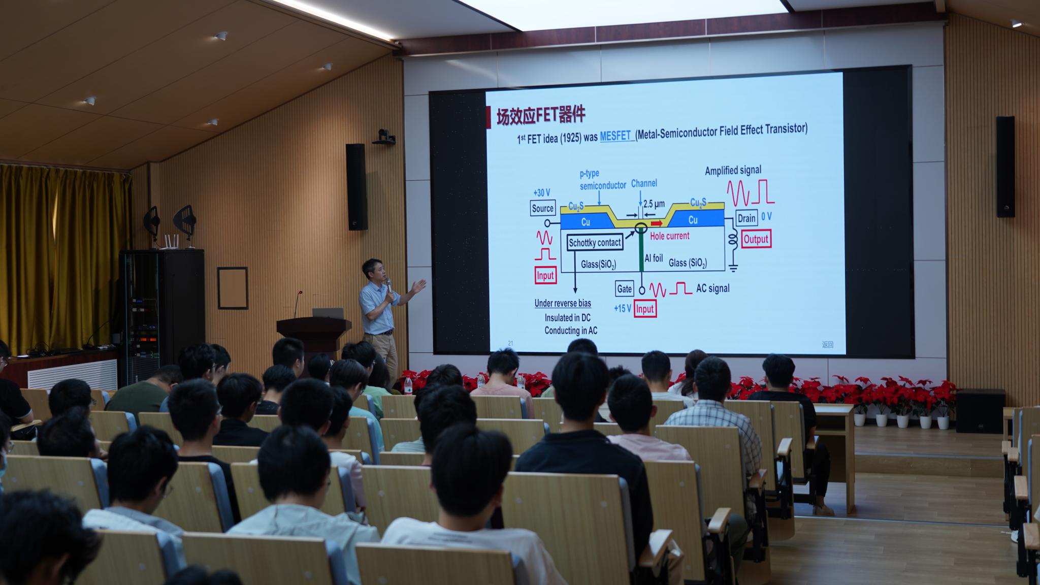 陈杰智教授紧扣全球信息技术与人工智能产业蓬勃发展的态势,围绕“如何正确认识当今快速发展的信息浪潮”“与AI时代共成长的大学生们最需要什么”等内容,聚焦专业领域的前沿进展与同学们进行交流,拓宽学生的视野。讲座分为“芯动力”和“AI与电子信息产业”两大主题。在“芯动力”部分,陈杰智教授从半导体材料基础“沙子”切入,系统回溯了芯片技术演进历程。他以场效应器件为范例,深入剖析了结构原理确立、关键技术突破、当前研发前沿及所面临的物理尺度极限挑战等重点内容,深刻阐释芯片技术发展瓶颈,探讨后摩尔时代提升集成密度的创新路径。