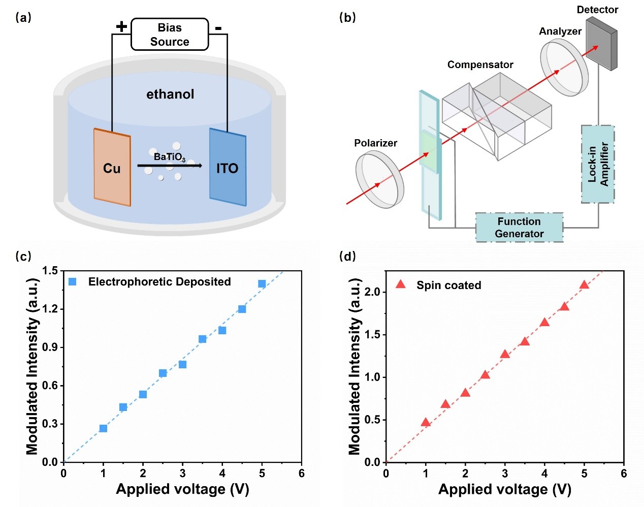 该研究创新性提出了一种电泳沉积(EPD)制备策略,通过外加电场驱动带电BTO纳米晶体在基底上有序沉积,促进晶体取向与极化方向的部分一致性,从而显著提升薄膜的电光响应。实验结果显示,EPD法制备的BTO纳米晶薄膜具有良好择优取向,其电光系数较传统旋涂法薄膜提升约360倍,甚至超过商用LiNbO3单晶。这一结果为低成本、高效率电光调制材料的开发提供了新思路。