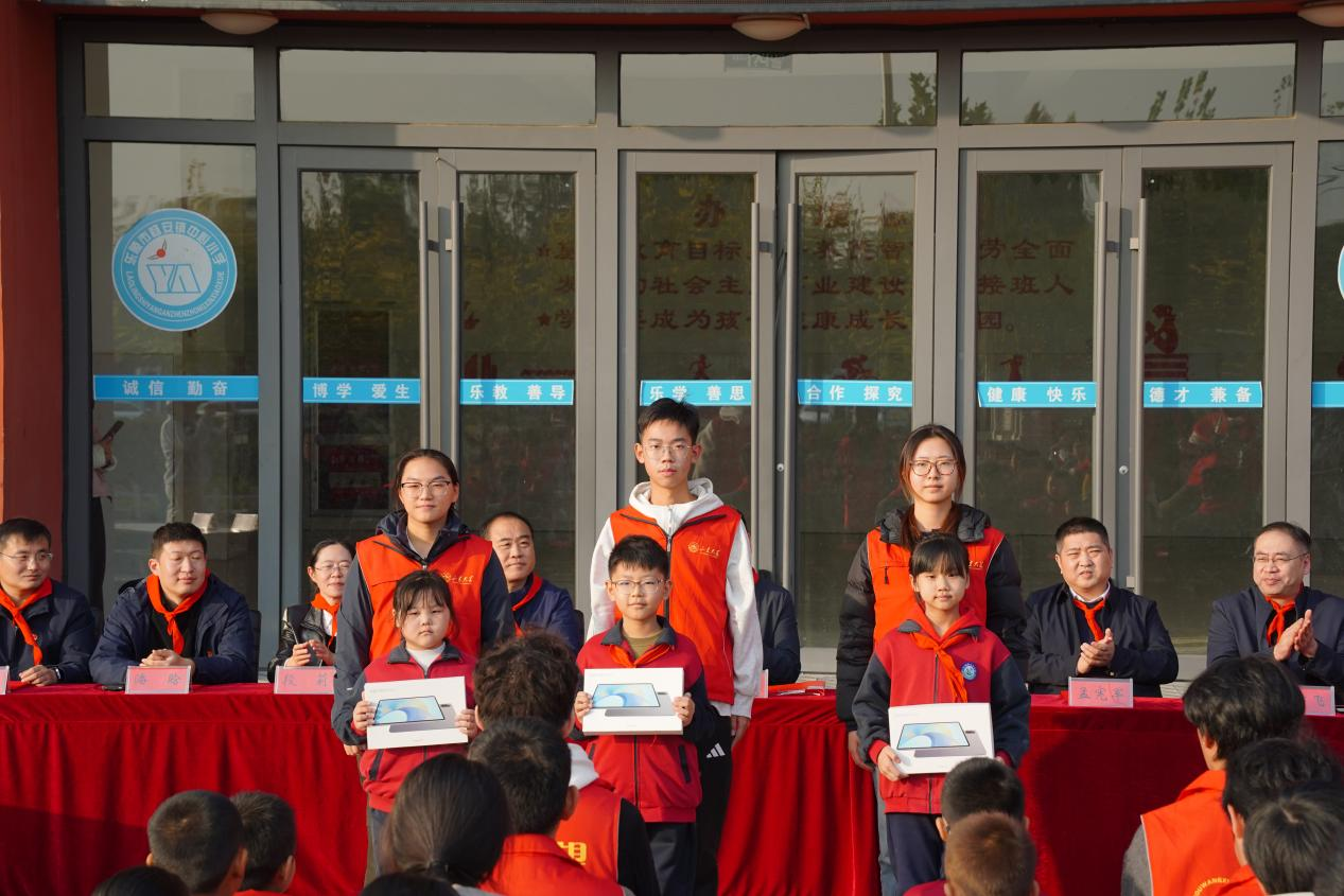 会上,“守望行动”志愿者代表、受助学生代表发言。志愿者代表向受助学生代表发放平板电脑。