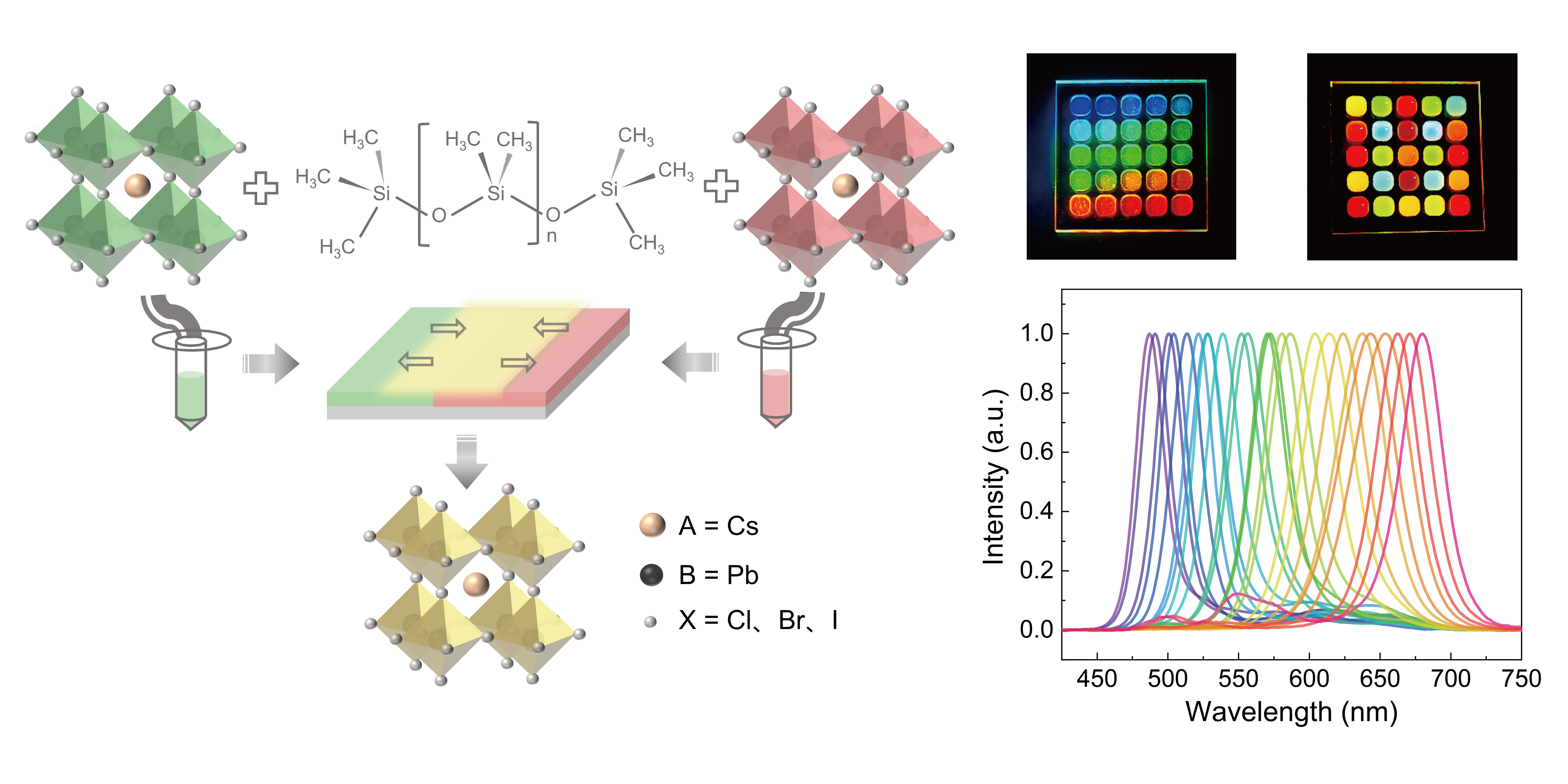 研究中提出的基于波分复用(WDM)技术的全光成像需要每个空间位置像元处均有一种特征光谱,光谱数量越多意味着可实现的空间分辨率越高。钙钛矿纳米晶具有较窄的半峰宽、高量子产率和可调谐的光致发光光谱,可以将紫外光转换至可见光波段进行成像,在该领域有很高的潜在应用价值。通过点胶工艺可以在玻璃基板上实现钙钛矿材料的原位阴离子交换,简化了材料的制备过程。此外,在钙钛矿中混合聚合物PDMS,隔绝了水分和空气的影响、抑制了离子迁移,其稳定性也得到了一定程度的提高。