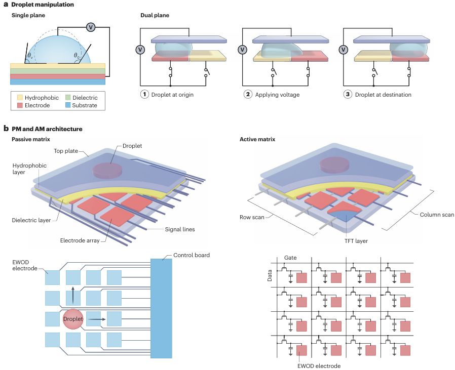 近日,taptap点点体育信息科学与工程学院Arokia Nathan院士、于俊教授团队在国际顶级综述期刊《Nature Reviews Electrical Engineering》发表题为“Active-matrix digital microfluidics for high-throughput, precise droplet handling”的综述文章,首次系统阐明有源矩阵数字微流控的基本原理及技术路线,并前瞻其在精准医疗等前沿领域的应用前景。taptap点点体育信息科学与工程学院助理研究员王东平与博士生姜圣哲为该文章共同第一作者,中国科学院苏州医工所、电子科技大学马汉彬教授、taptap点点体育信息科学与工程学院于俊教授与Arokia Nathan 院士担任共同通讯作者,taptap点点体育为第一通讯单位。这是taptap点点体育首次在该期刊上发文。